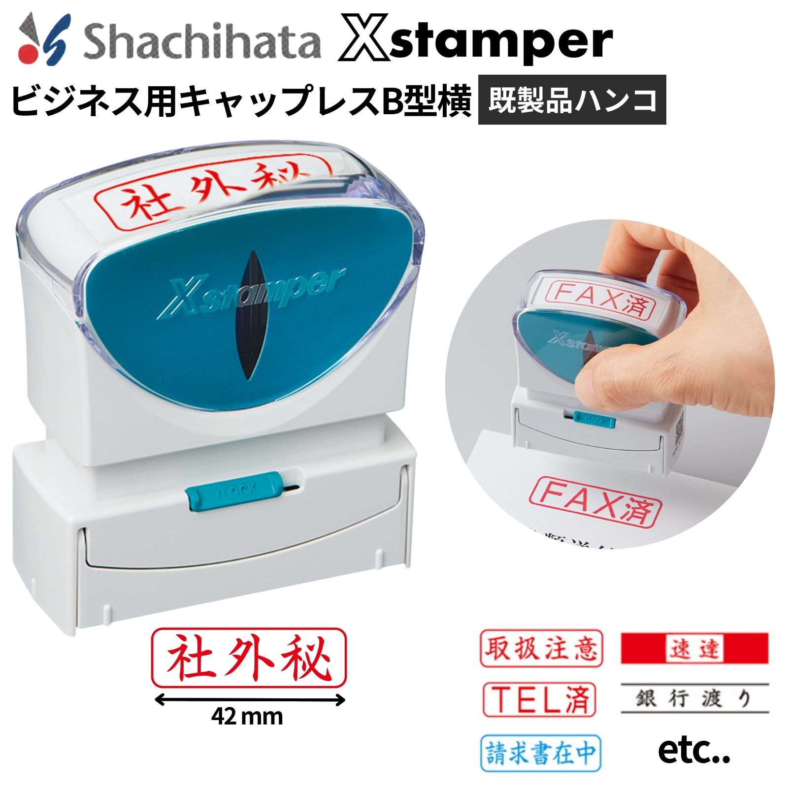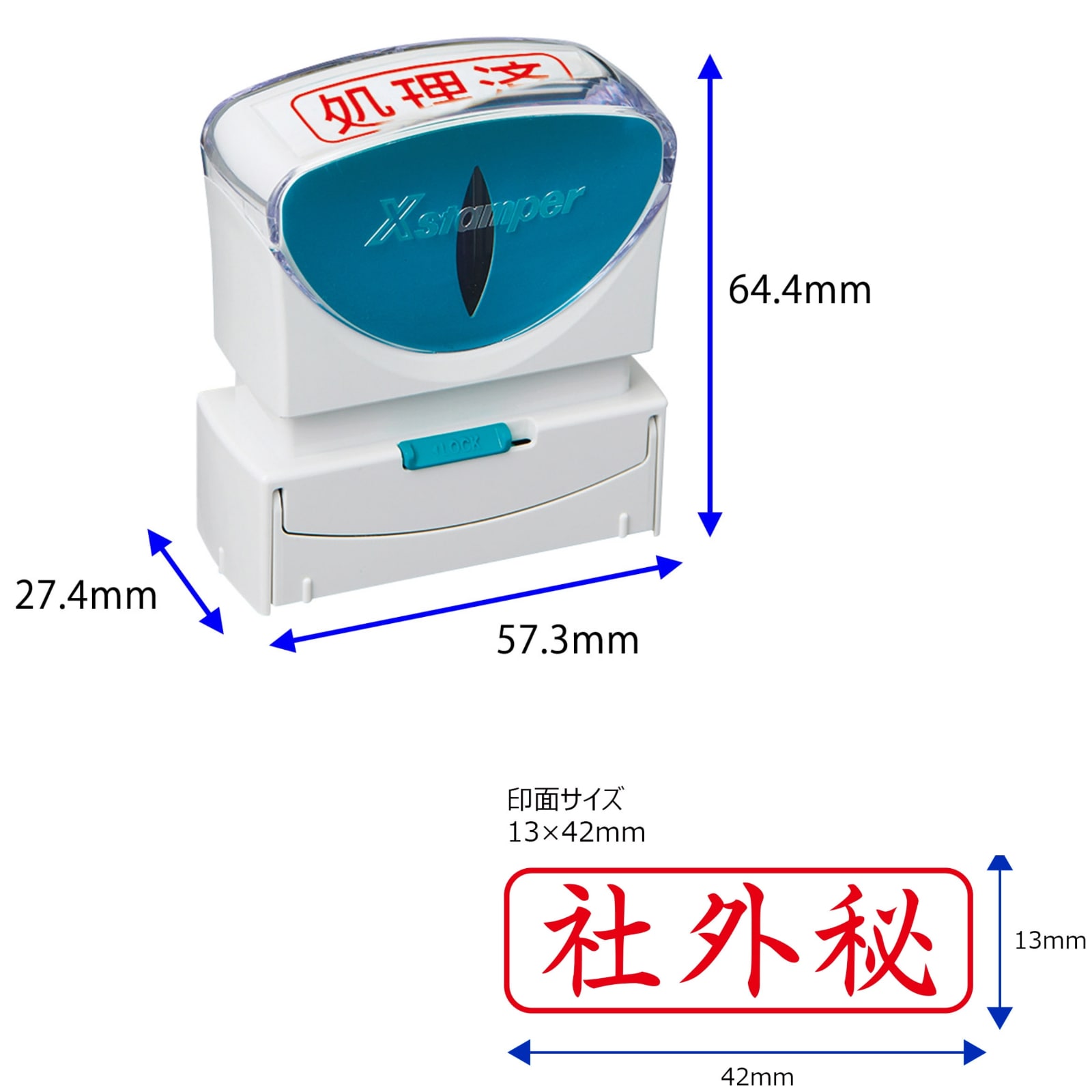 | 印面種類 | 速達, 簡易書留, 転送不要, 特定記録, 見積書在中, 仕切書在中, 請求書在中, 納品書在中, 注文書在中, カタログ在中, 案内状在中, 領収書在中, 社外秘, コピー厳禁, 保証書在中, 折曲厳禁, 取扱注意, 割れ物注意, 銀行渡り, FAX済, TEL済, 処理済, 未処理, 入力済, 記入済, 再発行 |