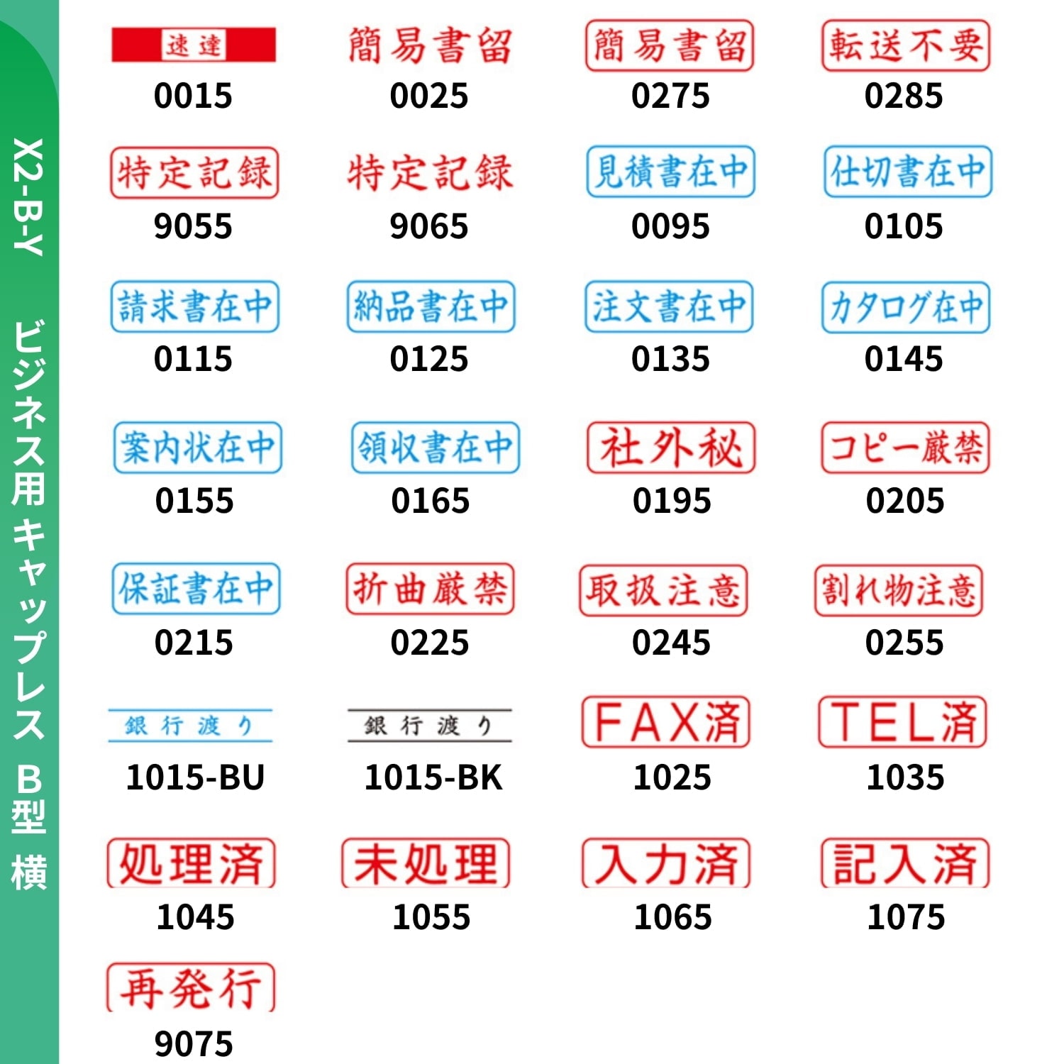 【ビジネス用キャップレスB型 横 (X2-B-Y) 印面 バリエーション】 速達, 簡易書留, 転送不要, 特定記録, 見積書在中, 仕切書在中, 請求書在中, 納品書在中, 注文書在中, カタログ在中, 案内状在中, 領収書在中, 社外秘, コピー厳禁, 保証書在中, 折曲厳禁, 取扱注意, 割れ物注意, 銀行渡り, FAX済, TEL済, 処理済, 未処理, 入力済, 記入済, 再発行 |